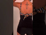 This tankini will visually reduce your abdominal area thanks to its cinched design. It also offers great support in the bust, with adjustable straps and adaptable center draping.